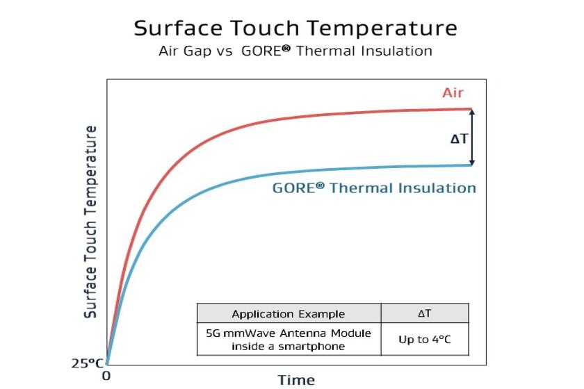 GORE Thermal Insulation significantly reduces smartphone 5G mmWave antenna hot spots, improving antenna thermal efficiency. Customer testing shows a surface temperature reduction of 1–4 °C is achievable.